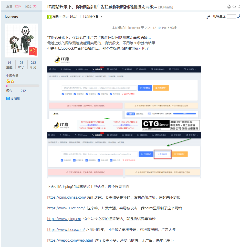今天在全球主机交流论坛上看到一篇有趣的帖子,大致的内容是作者浏览器安装了广告拦截插件,表示拦截ITDOG网站广告后,网站测速工具少了一个“高级选项”按钮,并喊话站长来修复这个 “BUG” ,在吐槽的同时也不忘夸奖几句,作为无辜吃瓜群众的我不禁有一种此人是我小号的错觉,故意发帖来反向宣传。