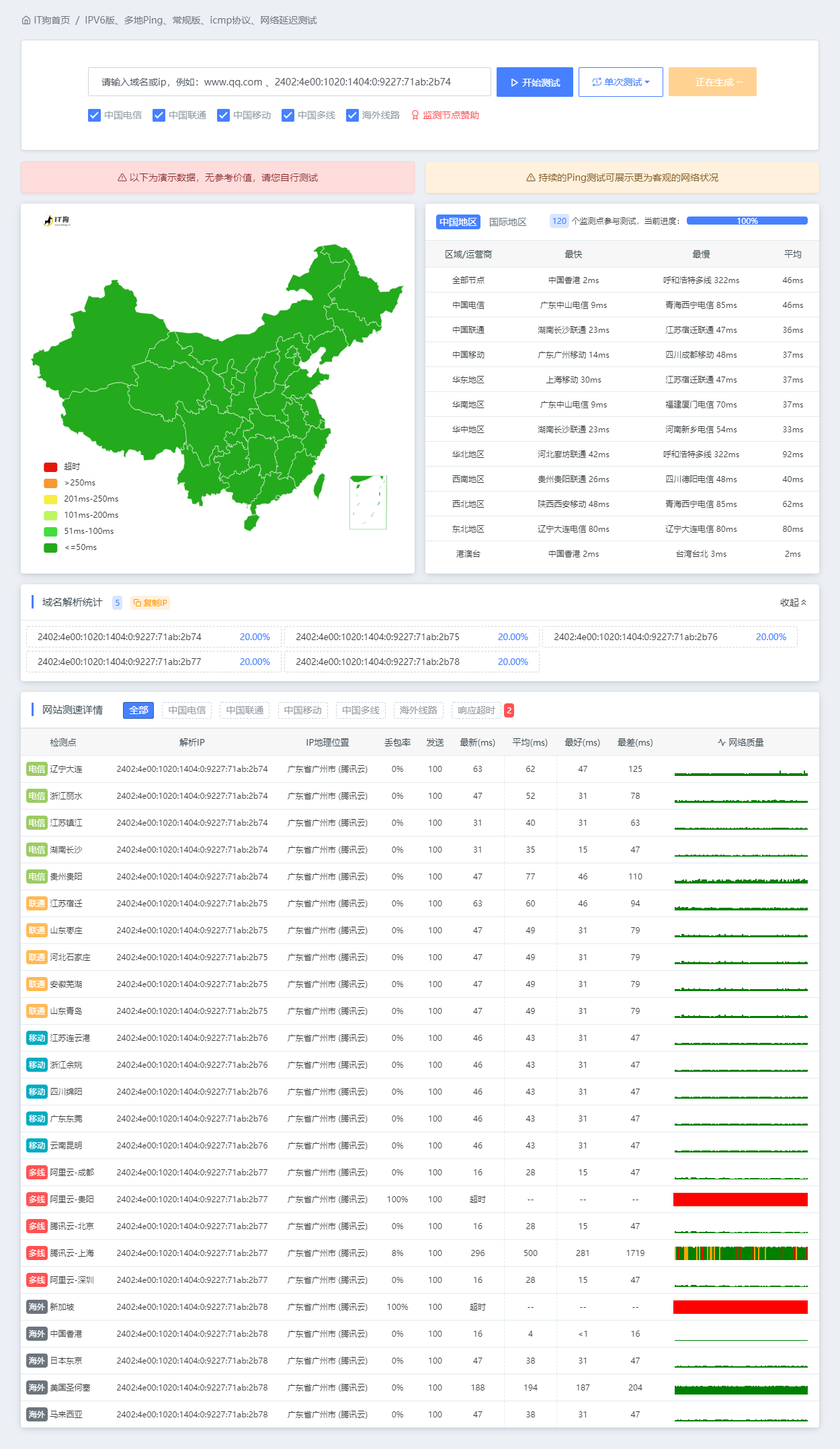 当前上线的IPV6监测点不多,会陆续增加,目前遇到的最大问题是天翼云(电信线路)的IPV6成本太高,满足需求的单个IPV6监测点成本接近300元/月,目前也是在寻求解决方案,期待有好的结果;