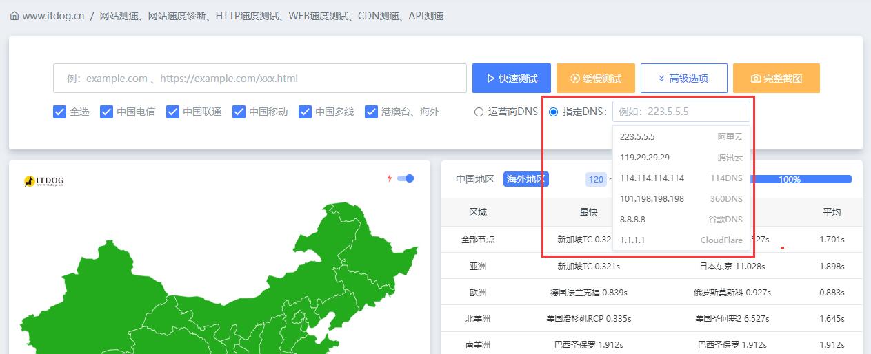 当选中默认的【运营商DNS】时,检测节点将使用运营商默认的DNS进行域名解析,当选中【指定DNS】时,需要输入有效DNS服务器(IPv4),点击输入框会推荐一些常用的公共DNS服务器,点击可快速填入;当怀疑是否存在运营商DNS污染的情况下,可指定DNS用于对比和判断;